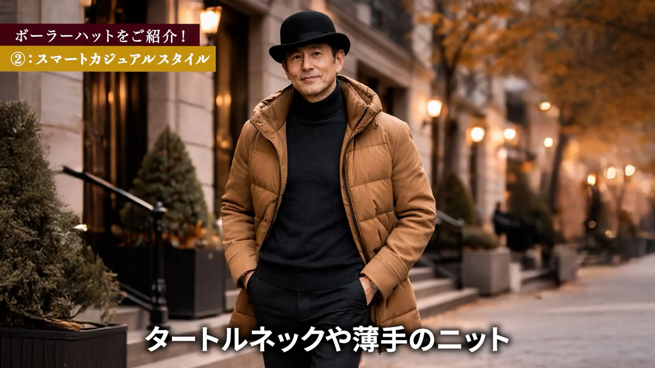 服装がシンプルになってくる年代の男性にとって、ボーラーハットは、