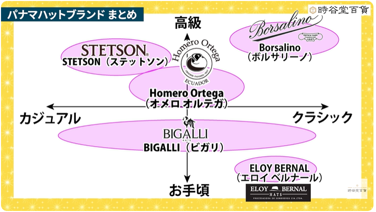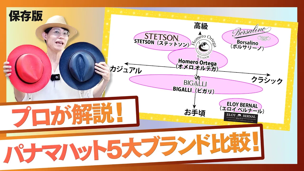 この記事では、YouTubeチャンネル「時宿堂帽子倶楽部」の動画(【保存版】プロが作成!パナマハットブランドチャートと選び方解説)の内容をもとに、代表的な5ブランドを「どんな人に向きやすいか」という視点でまとめます。選ぶ材料として読んでいただければと思います。