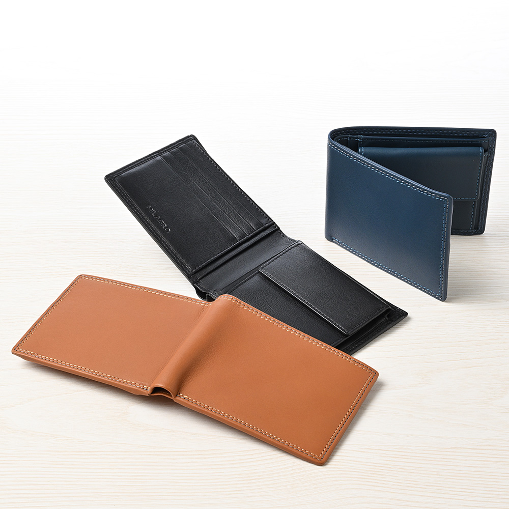 高級な牛革キップレザーを用いた、手ざわりスベスベでデザインもシンプルな、二つ折り財布。異なる色の2重のステッチが美しいアクセントに。