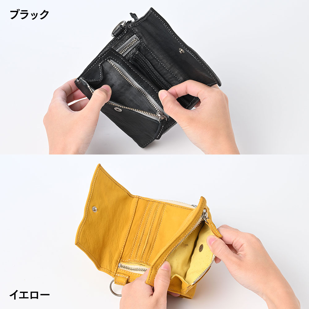 馬のヌメ革を使用し、縫製後に染色を行う製品染め(製品洗い)加工と、ユーズド加工を組み合わせることで、一般的な革財布とは異なる表情を持たせています。
