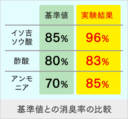 悪臭物質を中和し、ほぼ無臭化していることが分かります。