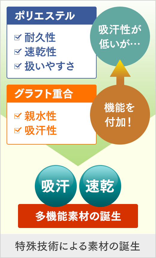 そこで、特殊技術・グラフト重合(※)により親水性を持たせ、ポリエステルのメリットはそのままに、高い吸汗性を持たせることに成功。