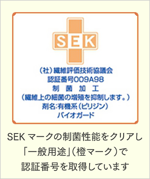 この技術により、JAFET(社団法人繊維評価技術協会)が品質保証した「制菌加工」SEKマークの認証を受けています。