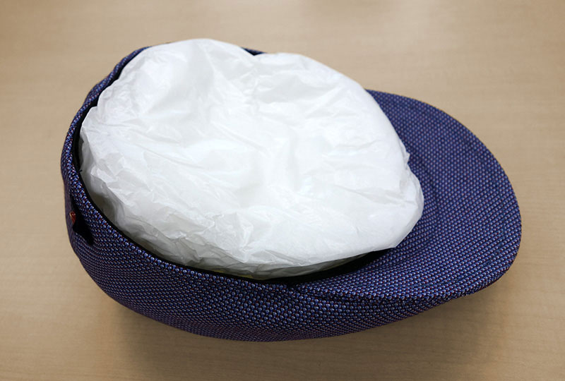 型崩れ防止のため、帽子の内側に丸めた薄紙等を詰めて保管することをおすすめいたします。保管するタンスには、適宜防虫剤や除湿剤をご使用ください。