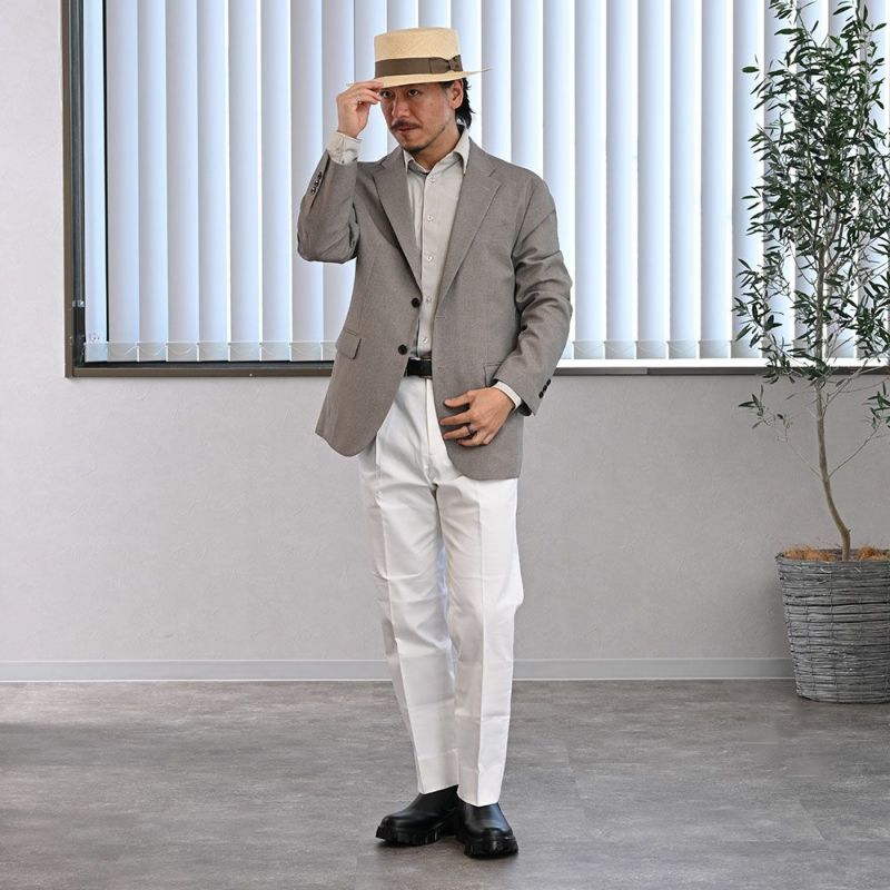シルエットの特徴は、クラウンが円筒形に近いこと。英語ではボーター、フランス語ではキャノチェとも呼ばれる、カンカン帽のスタイルです。程よい長さでフラットなブリムは、エッジ(縁)部分を折り返して縫う「折りべり」で仕立てられています。