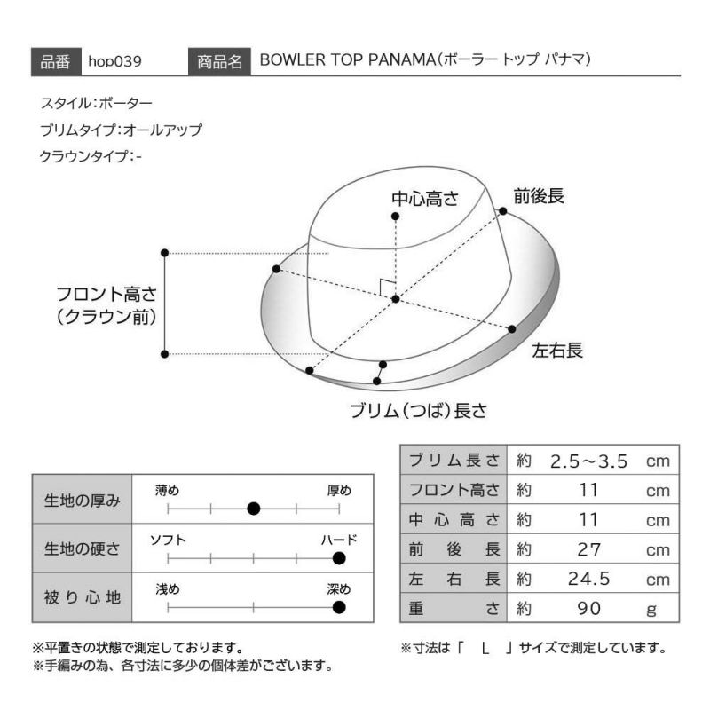 高貴なボーラーハットの雰囲気はそのままに、トップを平らに仕上げた、カジュアルなパナマハット。ショートタイプのトップハットやカンカン帽がお好きな方にもおすすめ。