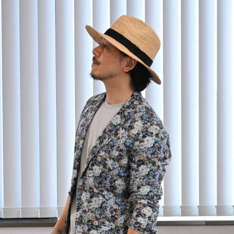 名前の通りフラットなロングブリムが特徴ですが、ラフィア特有のソフトな仕上げで、ブリムは自然に波打ったようなシルエットになっています。きっちり真っすぐなフラットではないところが、天然素材のハットらしくて味わい深いですね。女性にもおすすめします。