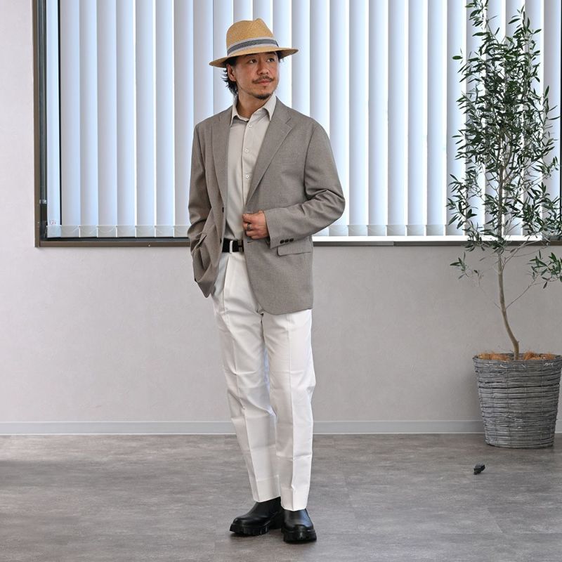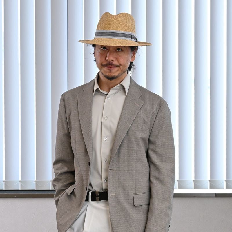 いい意味で本パナマらしくない独自の帽体カラーについ目が行きがちですが、ライトグレーのリボンもいい仕事をしていると思いますね。ドット柄のようでもあり、ストライプ柄のようでもあるこのリボンが、ちょうどいいバランスで帽体の存在感を引き立てています。