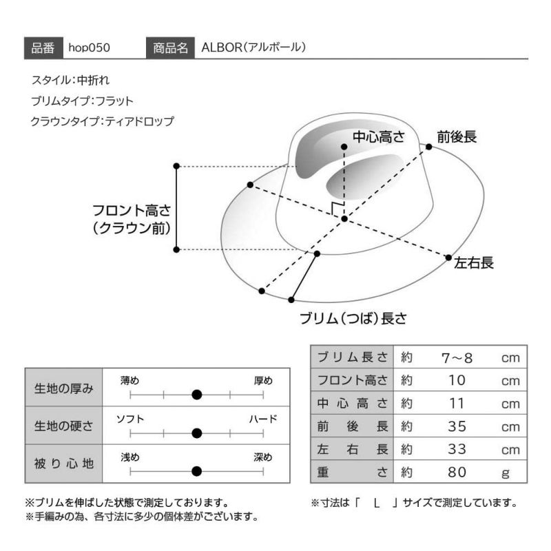 クラウントップはティアドロップ型で中心高さの数値もまあまあです。そのため、かぶり心地は悪くないと思います。やや長めのロングブリムで、形状はクセのないフラット。いかにも紳士の帽子らしい、シャープで洗練されたスタイリッシュな印象が自慢の一品です。