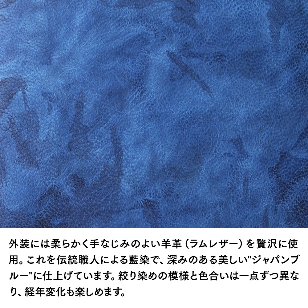 外装には柔らかく手なじみのよいシープレザー(羊革)を使用。伝統職人による、手絞りと藍染の樽に漬ける作業を3度繰り返す工程を経て、深みのある美しい"ジャパンブルー"に仕上げています。