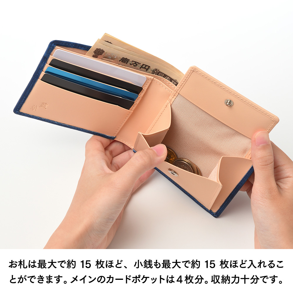 ■上質な羊革を伝統の藍染で仕上げた、二つ折り財布