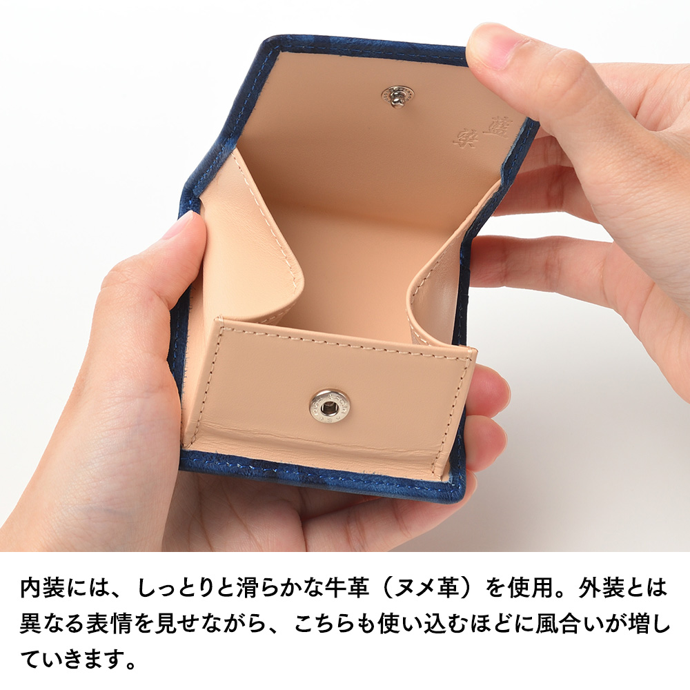 小銭入れはパカッと大きめに開くため、中身が見やすく、コインを取り出しやすい設計になっています。内装には、自然な風合いが特徴の牛革(ヌメ革・姫路レザー)を採用。外装との上品なコントラストを演出しています。