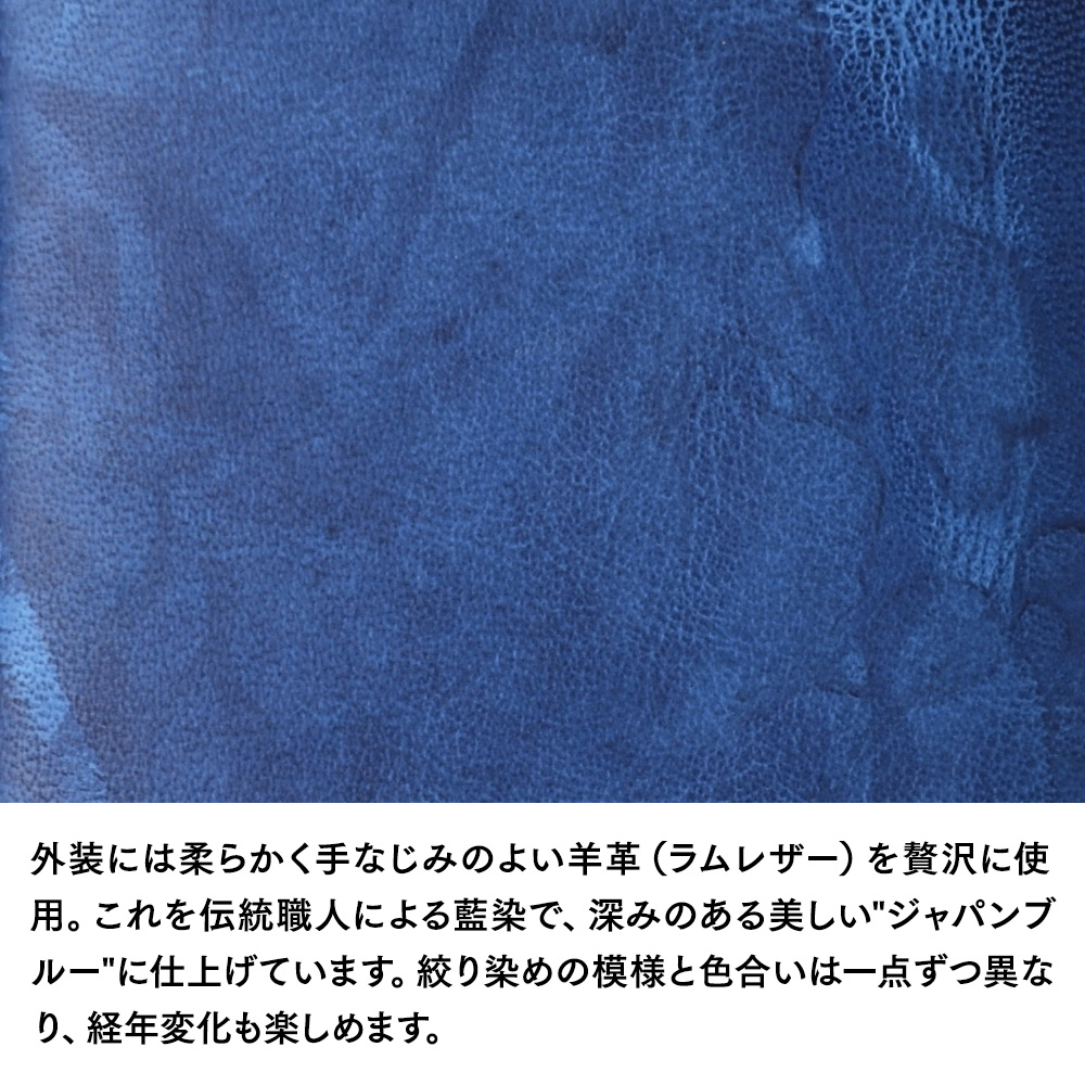 外装には柔らかく手なじみのよいシープレザー(羊革)を使用。伝統職人による、手絞りと藍染の樽に漬ける作業を3度繰り返す工程を経て、深みのある美しい"ジャパンブルー"に仕上げています。