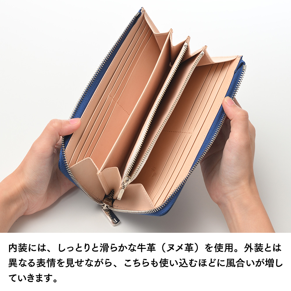 L字型のファスナーの採用で、口は大きめに開きます。このため、財布の中身が見やすく、お札・小銭・カードなどを出し入れしやすい設計になっています。会計をスマートに済ませられます。また内装には、自然な風合いが特徴の牛革(ヌメ革・姫路レザー)を採用。外装との上品なコントラストを演出しています。