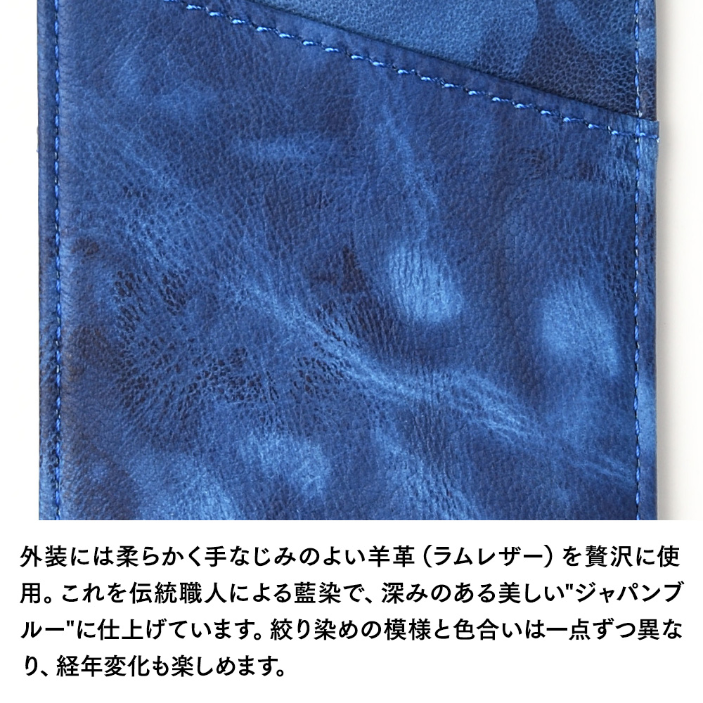 外装には柔らかく手なじみのよいシープレザー(羊革)を使用。伝統職人による、手絞りと藍染の樽に漬ける作業を3度繰り返す工程を経て、深みのある美しい"ジャパンブルー"に仕上げています。