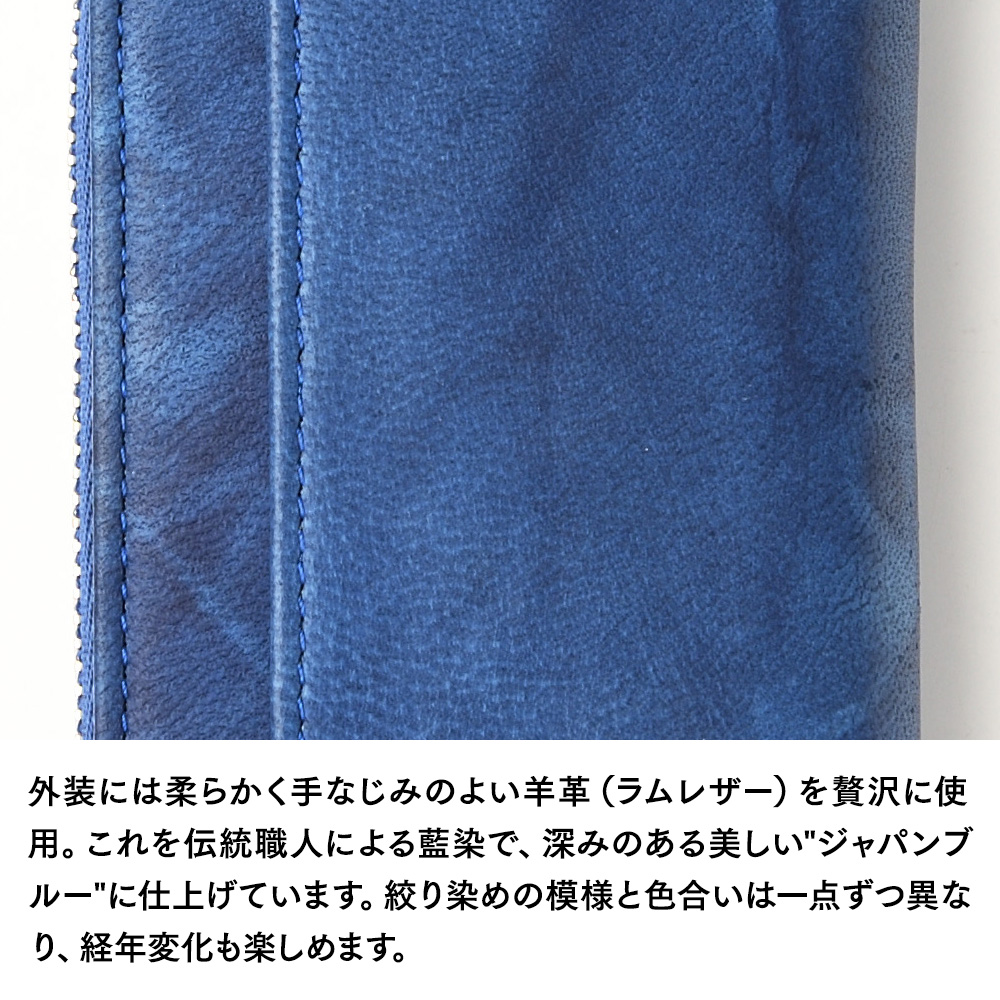 外装には柔らかく手なじみのよいシープレザー(羊革)を使用。伝統職人による、手絞りと藍染の樽に漬ける作業を3度繰り返す工程を経て、深みのある美しい"ジャパンブルー"に仕上げています。