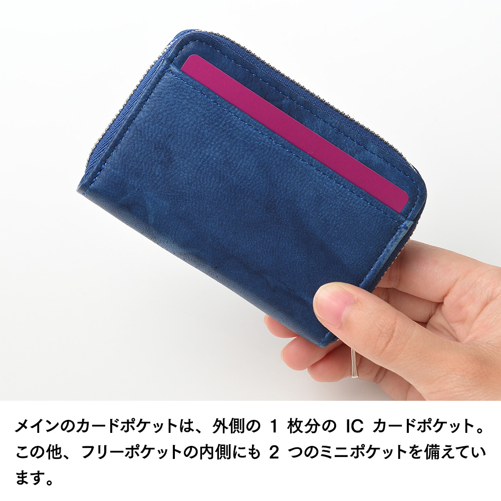 メインのカードポケットは、外側の1枚分のICカードポケット。この他、フリーポケットの内側にも2つのミニポケットを備えています。こちらは、使用頻度の少ないカード、ちょっとしたメモ、薄手のカード類などを収めるのに便利です。