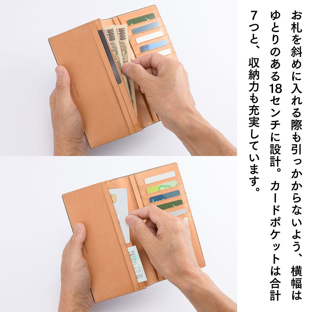 横幅18cmで紙幣の出し入れもスムーズ。仕切り付きの札入れや7つのカードポケットも備えた機能的な長財布です。