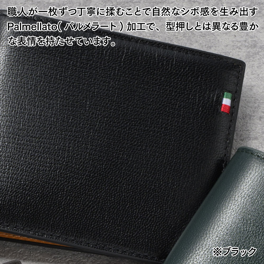 使用しているゴートレザーは、牛革よりも軽くて小ぶりなのが特長。中でも「パルメラート加工」は、職人が手作業で揉むことで細かなシボが生まれ、型押しとは異なる自然な風合いを演出します。使うほどに光沢が増し、高級感が際立つ革です。