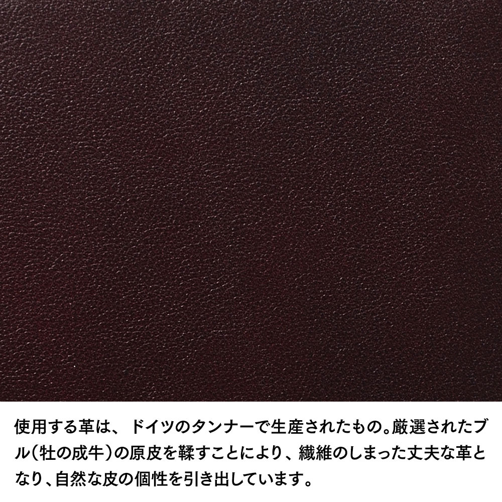 使用する革は、ドイツのタンナーで生産されたもの。厳選されたブル(牡の成牛)の原皮を鞣すことにより、繊維のしまった丈夫な革となり、自然な皮の個性を引き出しています。