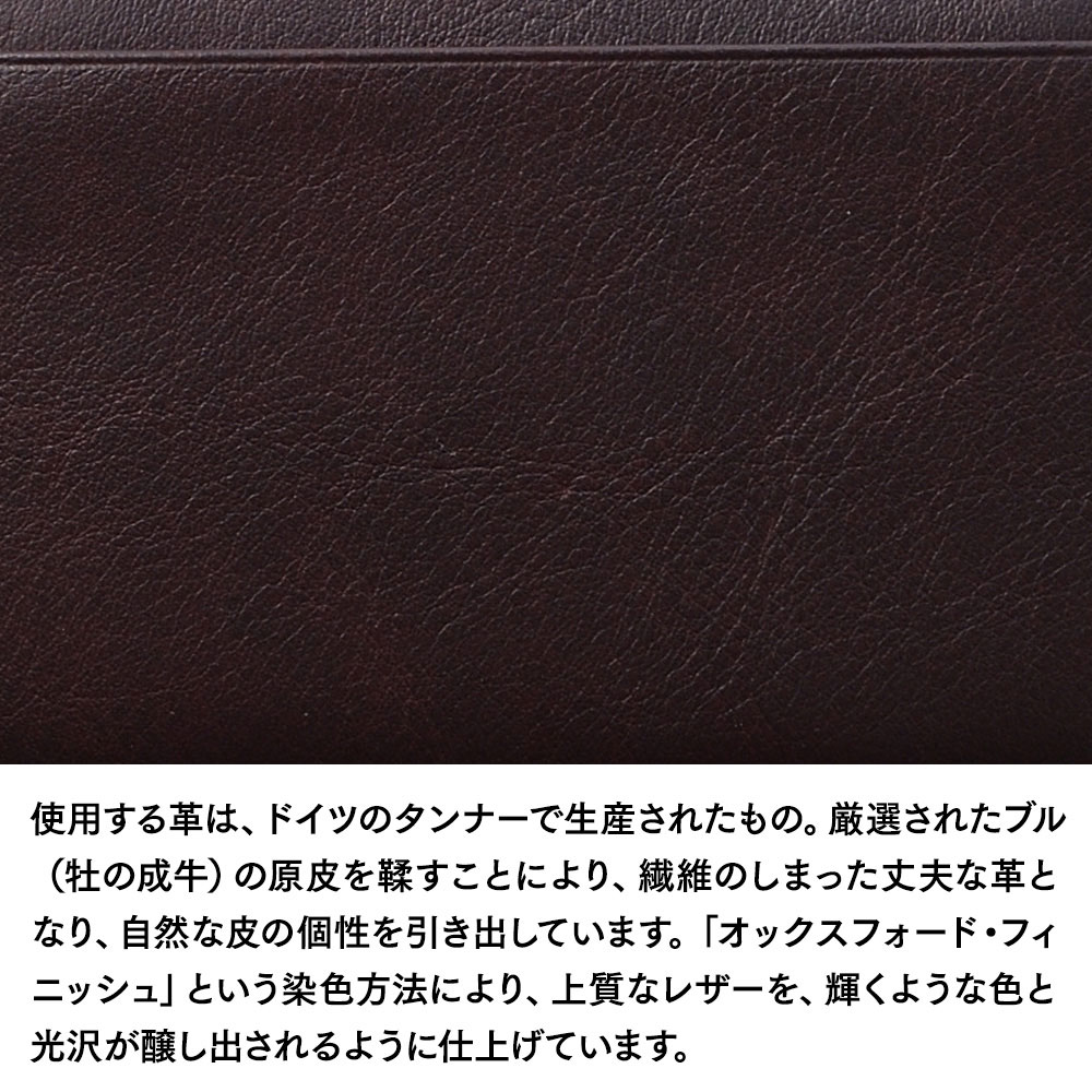 ゴールドファイル独自の染色方法「オックスフォード・フィニッシュ」により、輝くような色と光沢を醸し出すツートンカラーのレザーに仕上げています。オックスフォードラインに使用される皮革は、人間で言うならば「素肌の美しさ」を活かした“薄化粧”であり、個々の革が持つ特性を引き出し、原皮の良さを表現しています。