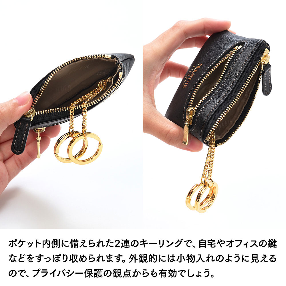 ポケット内側に備えられた2連のキーリングで、自宅やオフィスの鍵などをすっぽり収められます。外観的には小物入れのように見えるので、プライバシー保護の観点からも有効でしょう。外側のポケットには小銭などを入れられます。