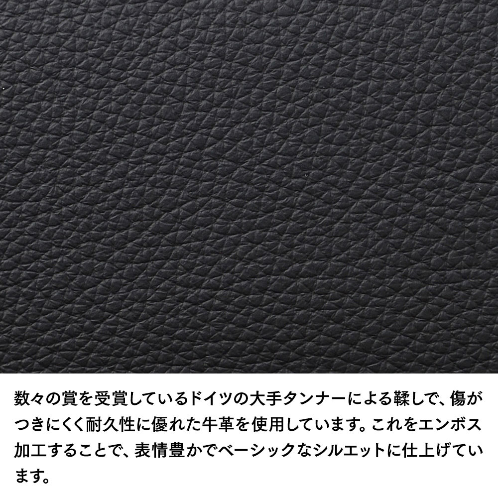 素材は、傷がつきにくく耐久性に優れたドイツ製の牛革です。カーシートや家具などにも使用される、とても丈夫な仕上げのレザーを採用しています。これをエンボス加工することで、表情豊かでベーシックなシルエットに仕上げています。