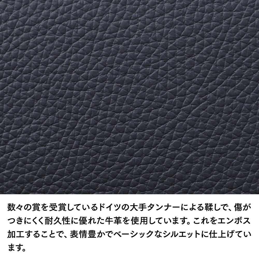 素材は、傷がつきにくく耐久性に優れたドイツ製の牛革です。カーシートや家具などにも使用される、とても丈夫な仕上げのレザーを採用しています。これをエンボス加工することで、表情豊かでベーシックなシルエットに仕上げています。
