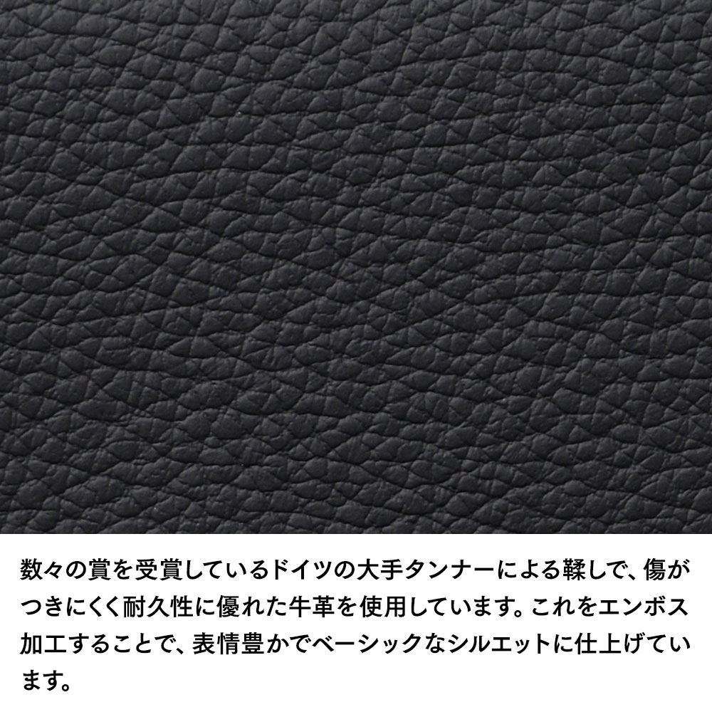 素材は、傷がつきにくく耐久性に優れたドイツ製の牛革です。カーシートや家具などにも使用される、とても丈夫な仕上げのレザーを採用しています。これをエンボス加工することで、表情豊かでベーシックなシルエットに仕上げています。