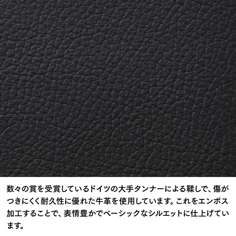 素材は、傷がつきにくく耐久性に優れたドイツ製の牛革です。カーシートや家具などにも使用される、とても丈夫な仕上げのレザーを採用しています。これをエンボス加工することで、表情豊かでベーシックなシルエットに仕上げています。