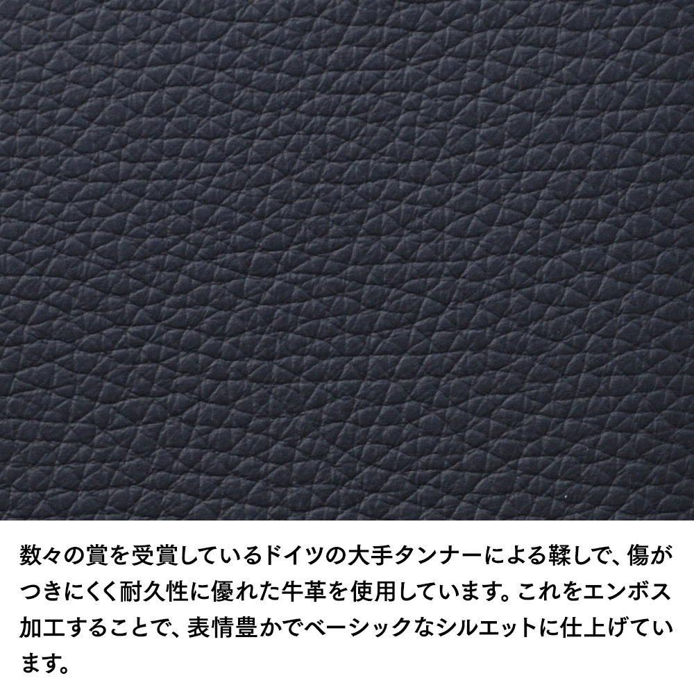 素材は、傷がつきにくく耐久性に優れたドイツ製の牛革です。カーシートや家具などにも使用される、とても丈夫な仕上げのレザーを採用しています。これをエンボス加工することで、表情豊かでベーシックなシルエットに仕上げています。