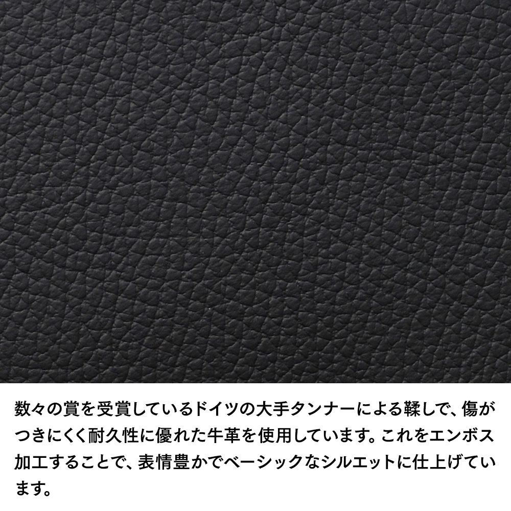 素材は、傷がつきにくく耐久性に優れたドイツ製の牛革です。カーシートや家具などにも使用される、とても丈夫な仕上げのレザーを採用しています。これをエンボス加工することで、表情豊かでベーシックなシルエットに仕上げています。