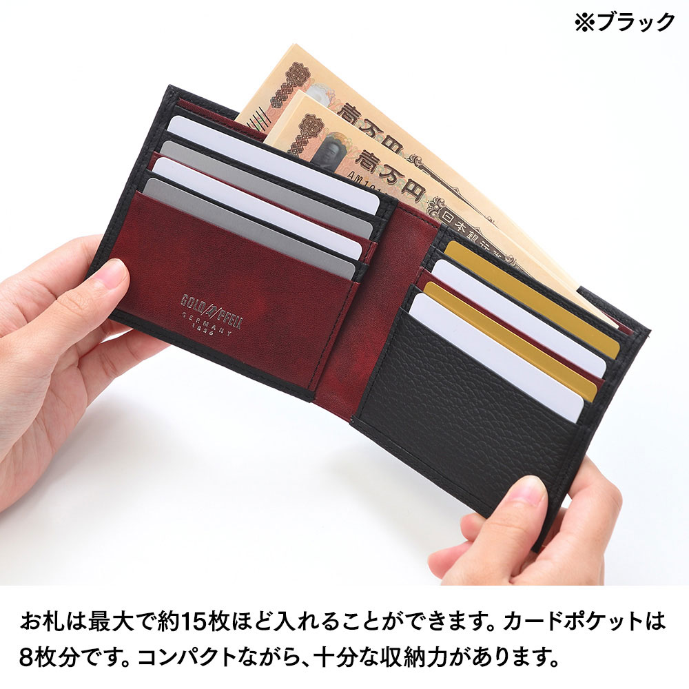 お札は最大で約15枚ほど入れることができます。カードポケットは8枚分です。すっきりコンパクトなデザインながら、十分な収納力のある二つ折り札入れになっています。