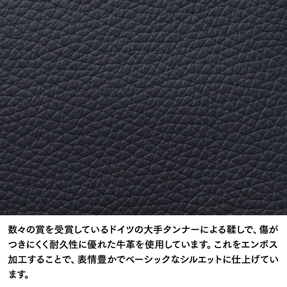 素材は、傷がつきにくく耐久性に優れたドイツ製の牛革です。カーシートや家具などにも使用される、とても丈夫な仕上げのレザーを採用しています。これをエンボス加工することで、表情豊かでベーシックなシルエットに仕上げています。