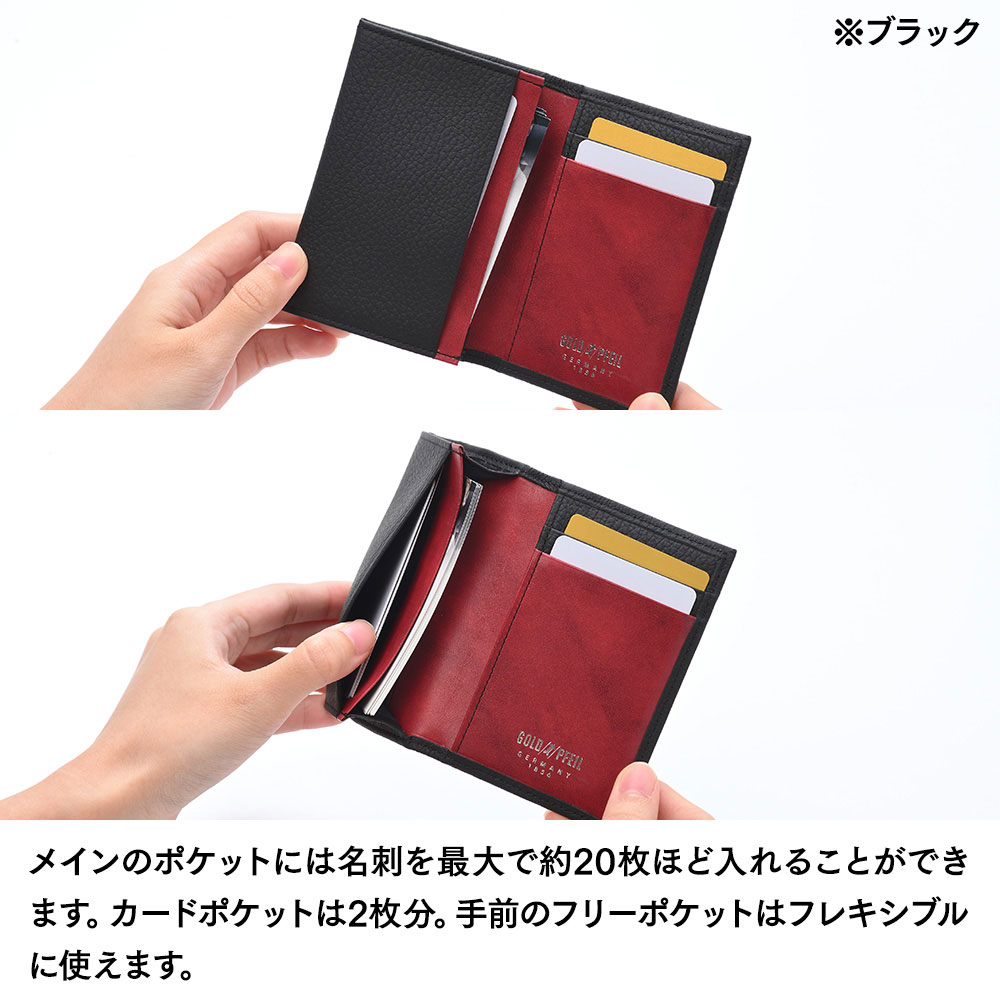 メインのポケットには名刺を最大で約20枚ほど入れることができます。カードポケットは2枚分。手前のフリーポケットは、カードはもちろん、先方からいただいた名刺を一時的に分けて保管するなどフレキシブルに使えます。