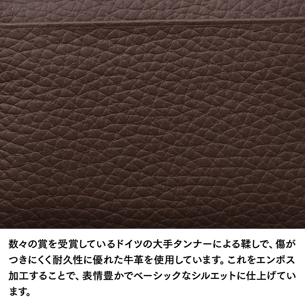 素材は、傷がつきにくく耐久性に優れたドイツ製の牛革です。カーシートや家具などにも使用される、とても丈夫な仕上げのレザーを採用しています。これをエンボス加工することで、表情豊かでベーシックなシルエットに仕上げています。