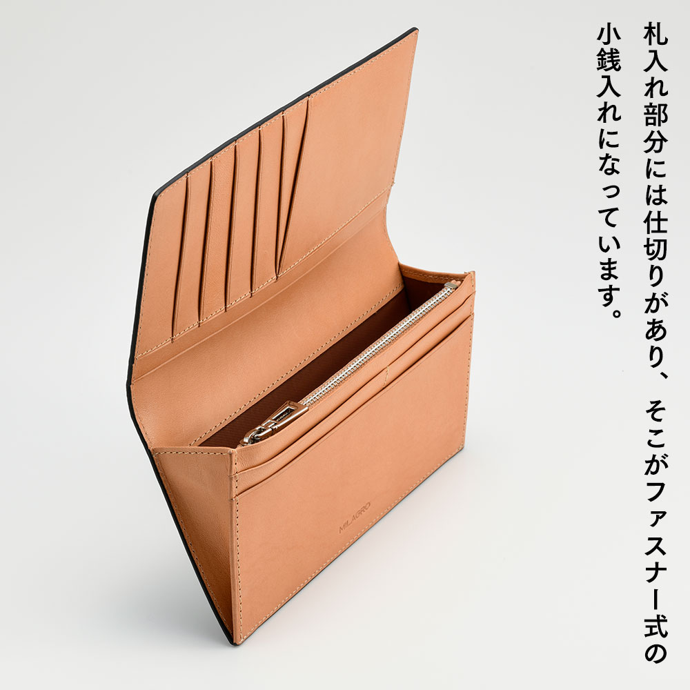 札入れ部分にはファスナー式小銭入れも備えています。内側には、伊・YANKEE社のナチュラルレザーを使用し、外側とは異なる軽やかな雰囲気を演出。仕上げには“切り目”と“コバ磨き”を採用し、端の美しい仕上がりが全体のシャープさを際立たせています。