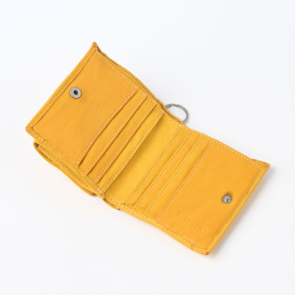 スナップボタンで留められた内側には、お札やカードが十分に収まります。外側のボックス型の小銭入れは大きめに開き、中身が見やすく、コインを取り出しやすい設計になっています。その反対側のフリーポケットは、交通系ICカードを入れるのに最適です。