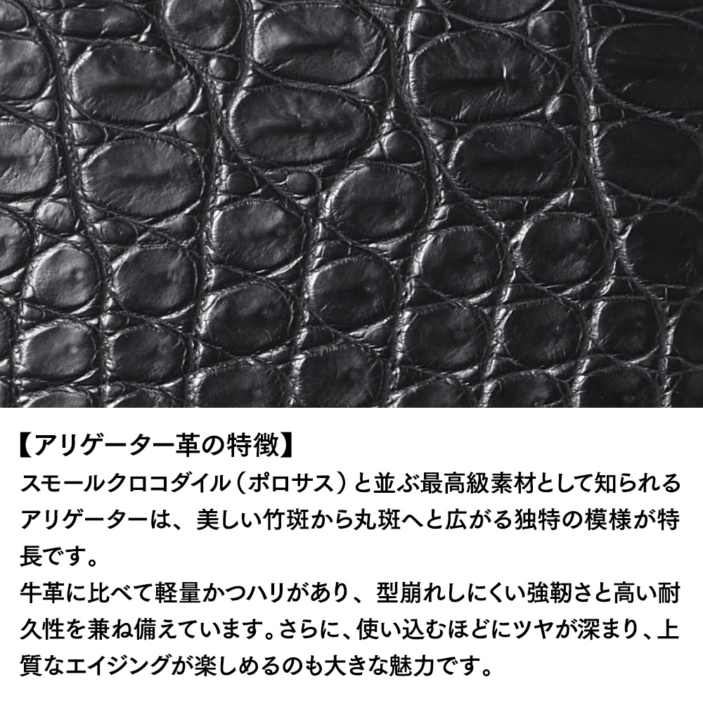 スモールクロコダイル(ポロサス)と並ぶ最高級素材として知られるアリゲーターは、美しい竹斑から丸斑へと広がる独特の模様が特長です。牛革に比べて軽量かつハリがあり、型崩れしにくい強靭さと高い耐久性を兼ね備えています。さらに、使い込むほどにツヤが深まり、上質なエイジングが楽しめるのも大きな魅力です。