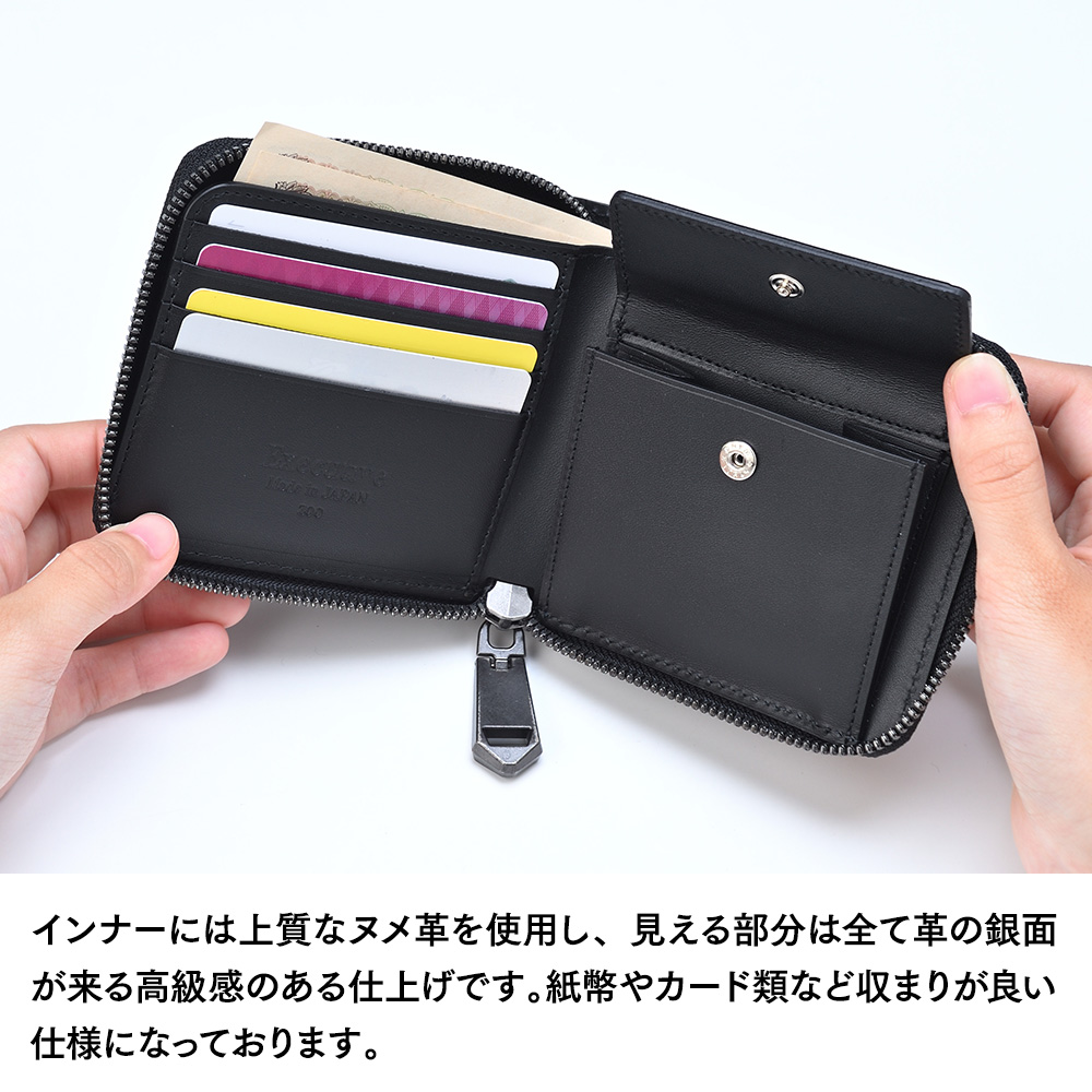 インナーには上質なヌメ革を使用し、見える部分に全て革の銀面が来る高級感のある仕上げです。紙幣やカード類など収まりがよい仕様になっています。札入れの片方はオープン仕様で、出し入れもスムーズです。