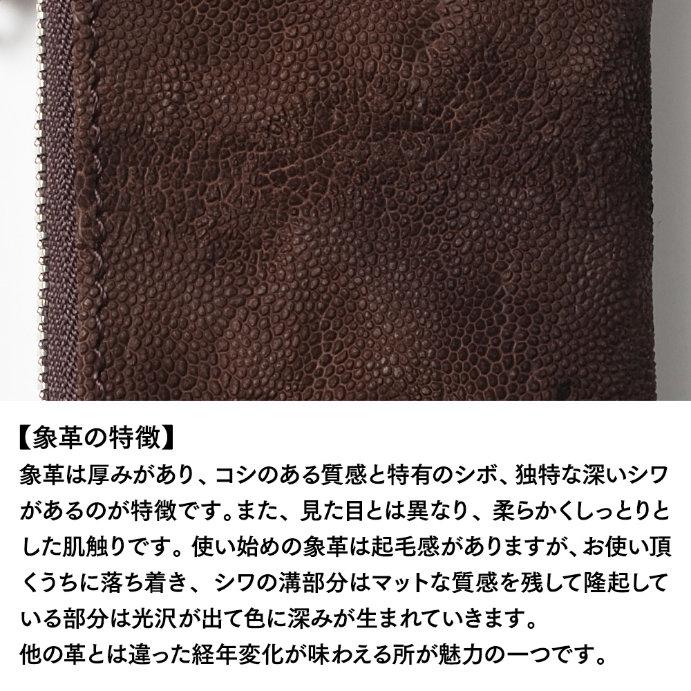 象は古くから富と安定、成功の象徴とされてきた存在です。ヒンドゥーの「ガネーシャ神」にも象徴されるように、商売繁盛・財運向上などを願う方にも縁起の良いレザーとなっています。化粧箱に入っているので、大切な贈り物にもおすすめです。