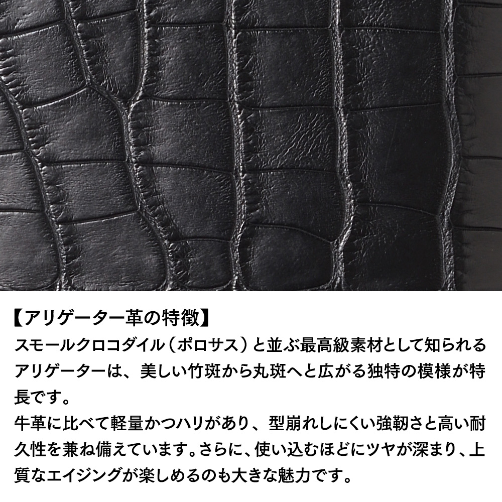 スモールクロコダイル(ポロサス)と並ぶ最高級素材として知られるアリゲーターは、美しい竹斑から丸斑へと広がる独特の模様が特長です。牛革に比べて軽量かつハリがあり、型崩れしにくい強靭さと高い耐久性を兼ね備えています。さらに、使い込むほどにツヤが深まり、上質なエイジングが楽しめるのも大きな魅力です。