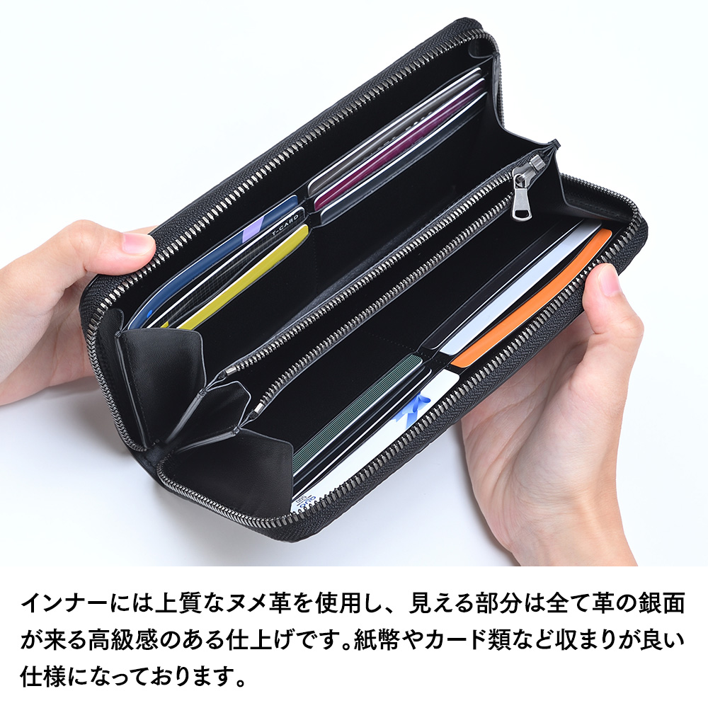 インナーには上質なヌメ革を使用し、見える部分に全て革の銀面が来る高級感のある仕上げです。紙幣やカード類など収まりがよい仕様になっています。カード収納は、たっぷり12枚分です。