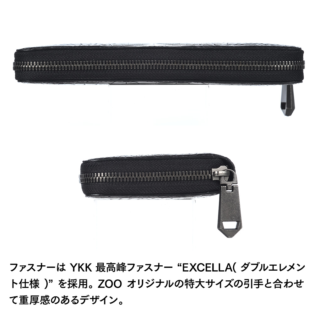 ファスナーは、YKK 最高峰ファスナーEXCELLA(ダブルエレメント仕様)を採用。ZOO(ズー)オリジナルの特大サイズの引手と合わせて重厚感のあるデザインです。