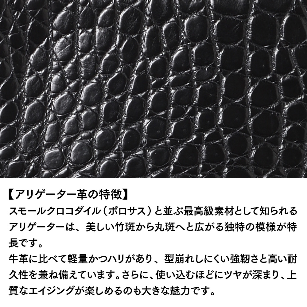 スモールクロコダイル(ポロサス)と並ぶ最高級素材として知られるアリゲーターは、美しい竹斑から丸斑へと広がる独特の模様が特長です。牛革に比べて軽量かつハリがあり、型崩れしにくい強靭さと高い耐久性を兼ね備えています。さらに、使い込むほどにツヤが深まり、上質なエイジングが楽しめるのも大きな魅力です。