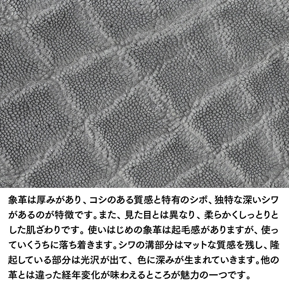 象革は厚みがあり、コシのある質感と特有のシボ、独特な深いシワがあるのが特徴です。また、見た目とは異なり、柔らかくしっとりとした肌ざわりです。 使いはじめの象革は起毛感がありますが、使っていくうちに落ち着きます。シワの溝部分はマットな質感を残し、隆起している部分は光沢が出て、色に深みが生まれていきます。他の革とは違った経年変化が味わえるところが魅力の一つです。