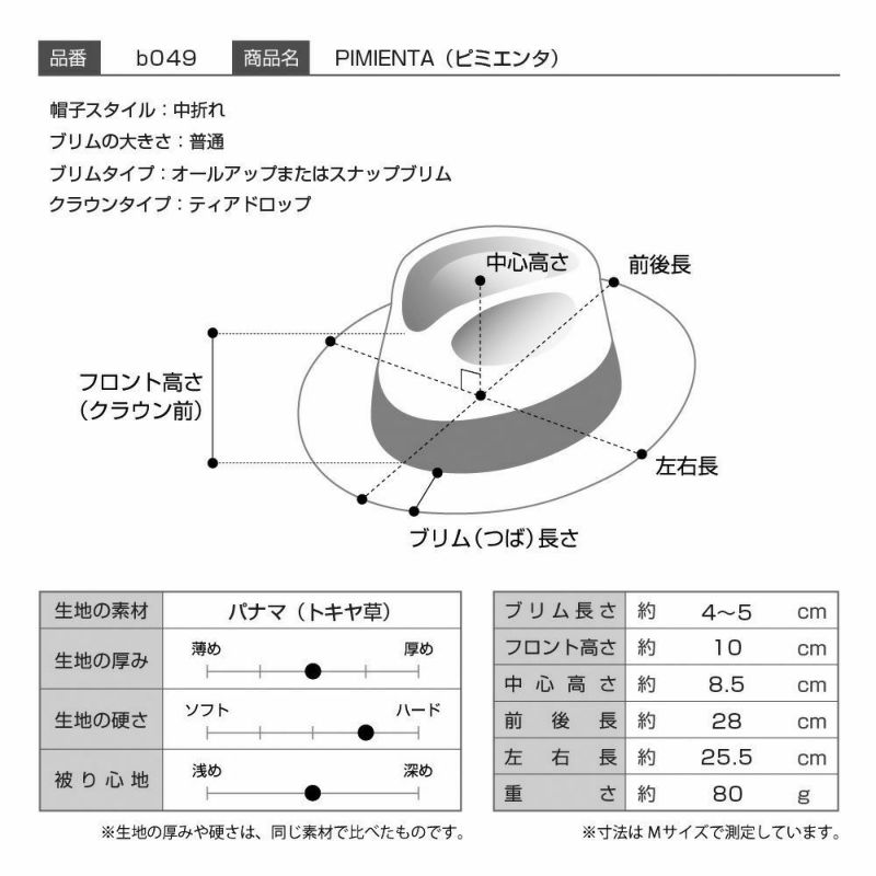 PIMIENTA(ピミエンタ)は、スペイン語で「胡椒」という意味です。仕様、デザインともに個性的なこのパナマを身に着ければ、いつものコーディネートにピリッと変化の利いたスパイスを加えられます。優雅な雰囲気もあるので女性の方にもおすすめです。