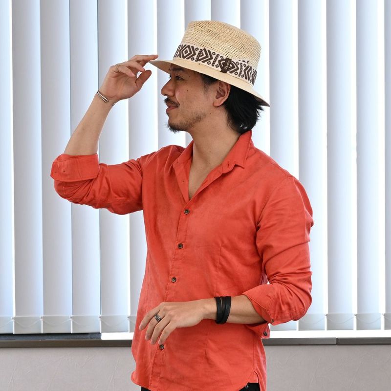 エクアドル産のトキヤ草を用いて、クラウンを通気性抜群のかぎ針編み、ブリムを網代編みと石目編みで仕立てたパナマハット。エスニックな柄のリボンが、夏を盛り上げる。