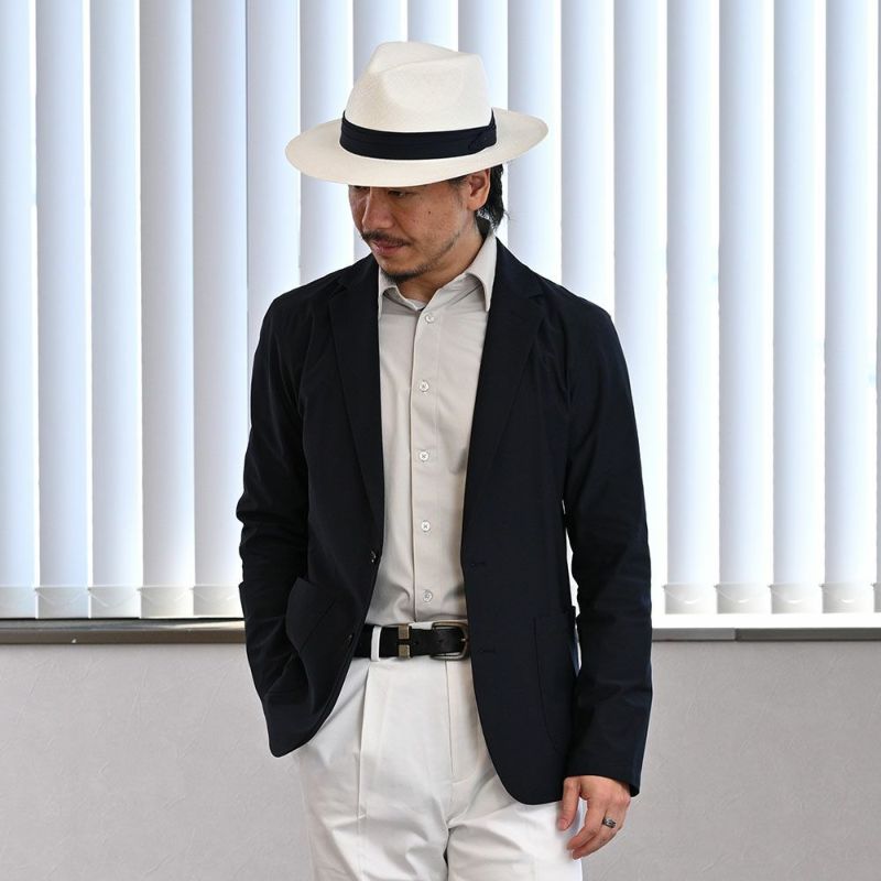 涼しさ重視の石目編みはひとつ格上の細やかな編み目に、リボンは高級ラインのパナマハットのシンボルとも言える段巻きに、と「ワンランク上」を意識して仕上げられた逸品アイテムです。シャープなクラウントップとフラットブリムが描くシルエットも美しいです。