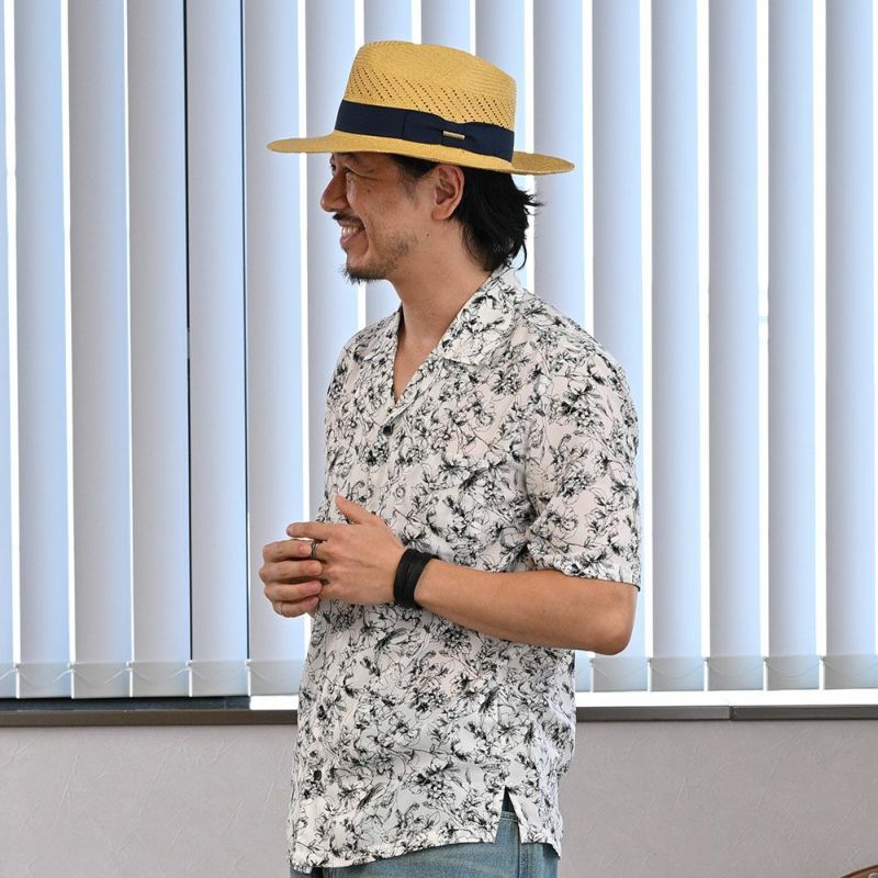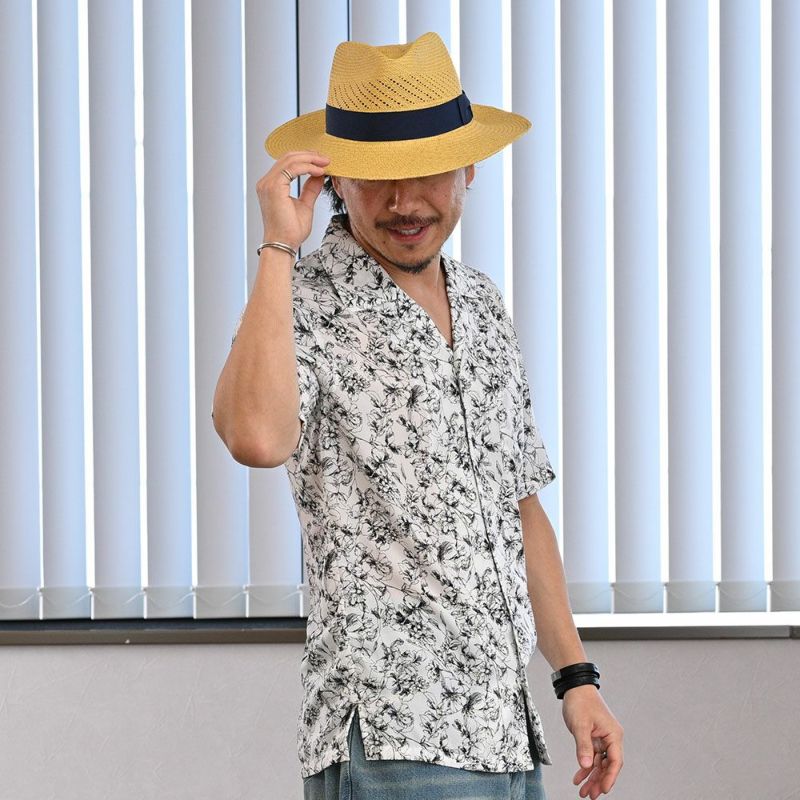 気持ち長めのブリム(つば)は、クセのないフラットタイプです。サイドクラウンに巻かれたハットリボンは、濃いネイビー。帽体との絶妙なコントラストを演出しています。海、山、湖畔。夏の景色に似合うカラーリングとなっています。